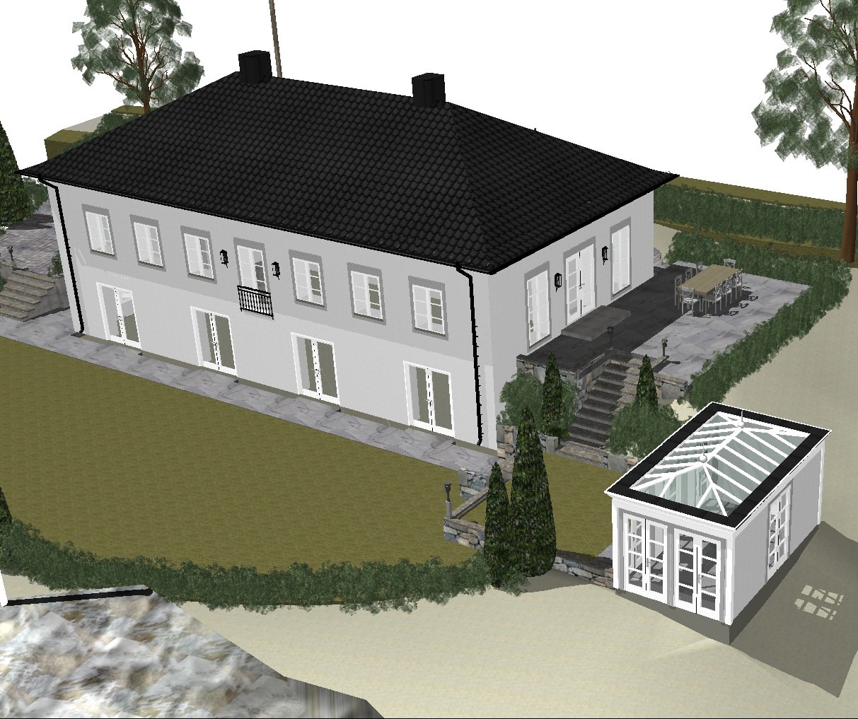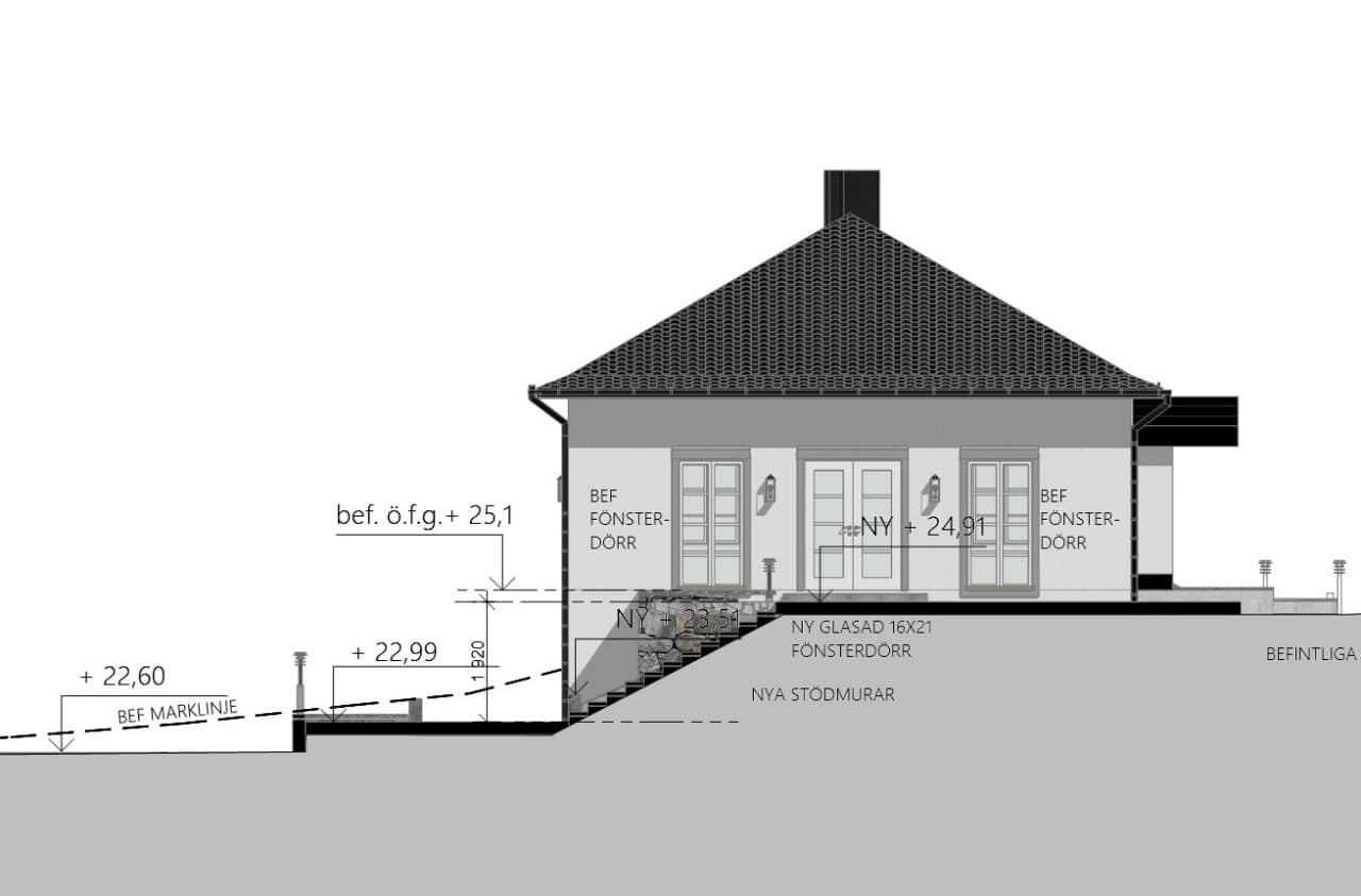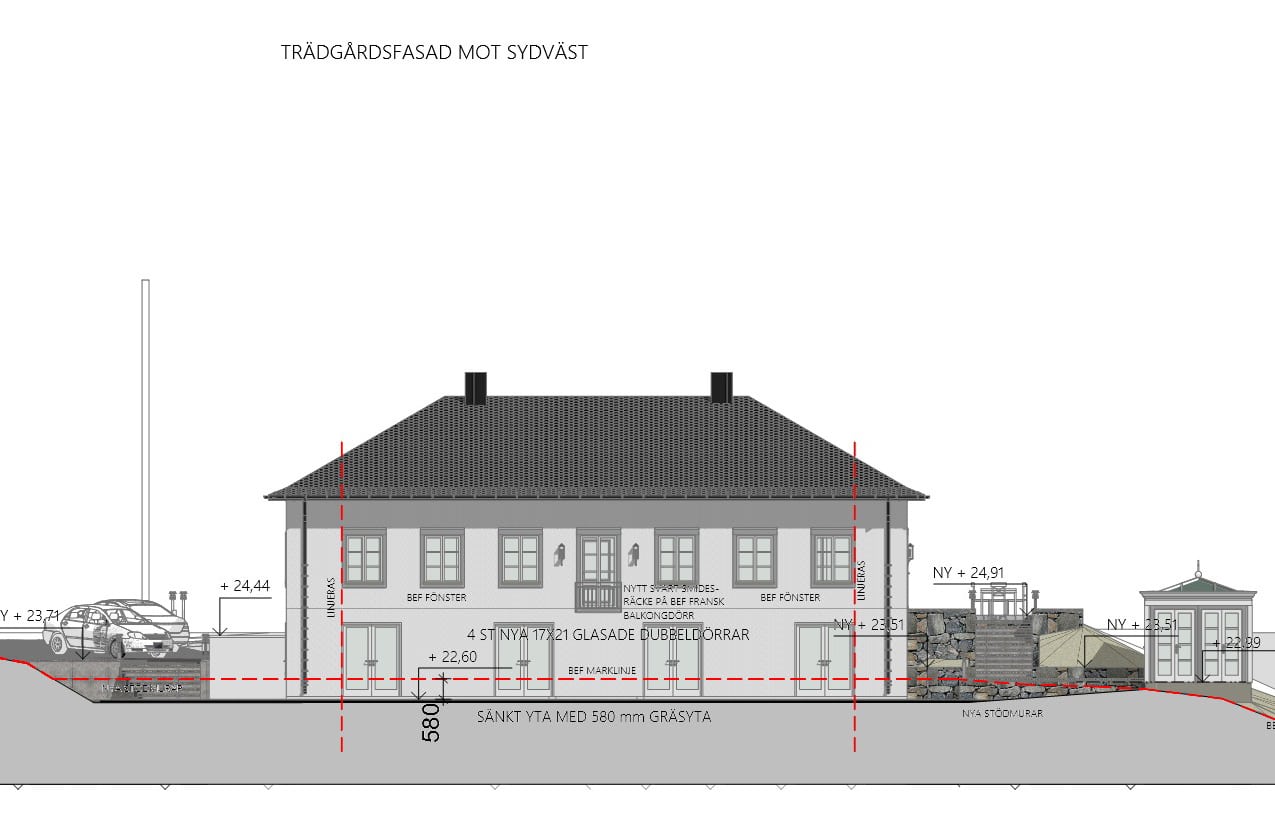 Sagt och gjort – en mer markerad bågformad yta planerades och den rad av smala mindre källarfönster skall ersättas med fyra stycken nya glasade dubbeldörrar för att ge en mer uppgraderad stolt pampig värdig träsgårdsfasad utåt.