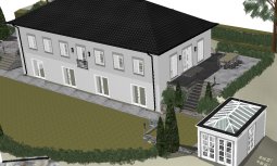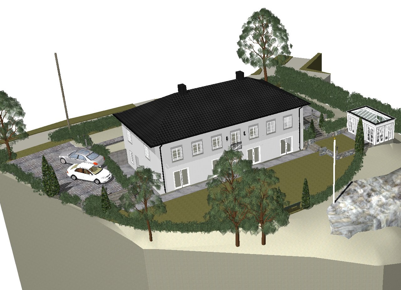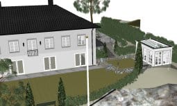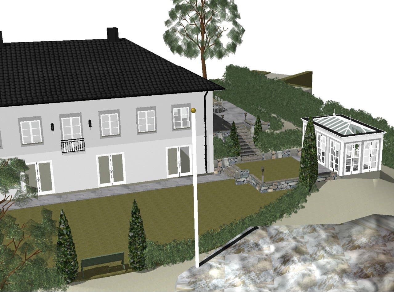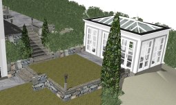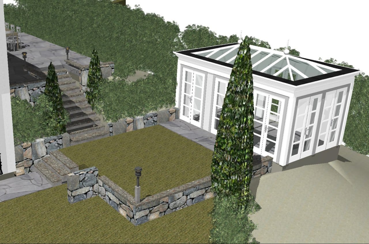 En kompletterande glasad trädgårdspaviljong skall ingå i projektet som är tänkt att användas för socialt umgänge med sin uterumskaraktär och placeras längre ner i den nyskapta terrasserade sluttningen. Trappor, stödmurar och gångstråk i natursten skall förbinda de olika terrasserade ytorna för att då kunna binda ihop de flertal delarna av trädgården på ett mjukt och behagligt sätt .